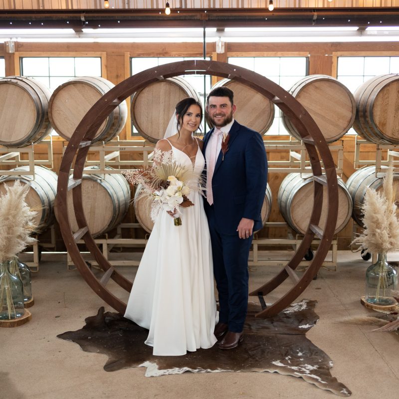The couple got married in front of our Chadwick Geometric Backdrop with custom colors inserts that we adore. They reused the backdrop as a focal point behind their head table for the rest of the night!